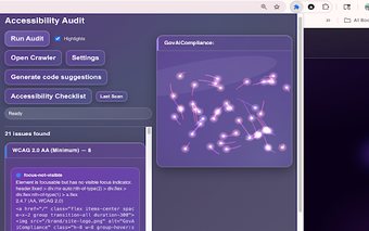 GovAiCompliance: Accessibility Auditor เป็นส่วนขยาย Chrome ฟรีที่ออกแบบมาเพื่อปรับปรุงการเข้าถึงเว็บโดยการตรวจสอบหน้าเว็บเพื่อให้เป็นไปตามมาตรฐาน WCAG และ Section 508 เครื่องมือนี้ช่วยให้ผู้ใช้สามารถทำการตรวจสอบการเข้าถึงอย่างละเอียดโดยการค้นหาเว็บไซต์เพื่อระบุปัญหา โดยมีตัวเลือกการสแกนทั้งที่ใช้ AI และมาตรฐาน ฟีเจอร์หลักรวมถึงข้อเสนอแนะการแก้ไขโค้ดอัตโนมัติและความสามารถในการสร้างรายงานสรุปอย่างเป็นทางการ ทำให้เป็นเครื่องมือที่จำเป็นสำหรับนักพัฒนาและผู้ดูแลเว็บที่ต้องการปรับปรุงการเข้าถึงของเว็บไซต์